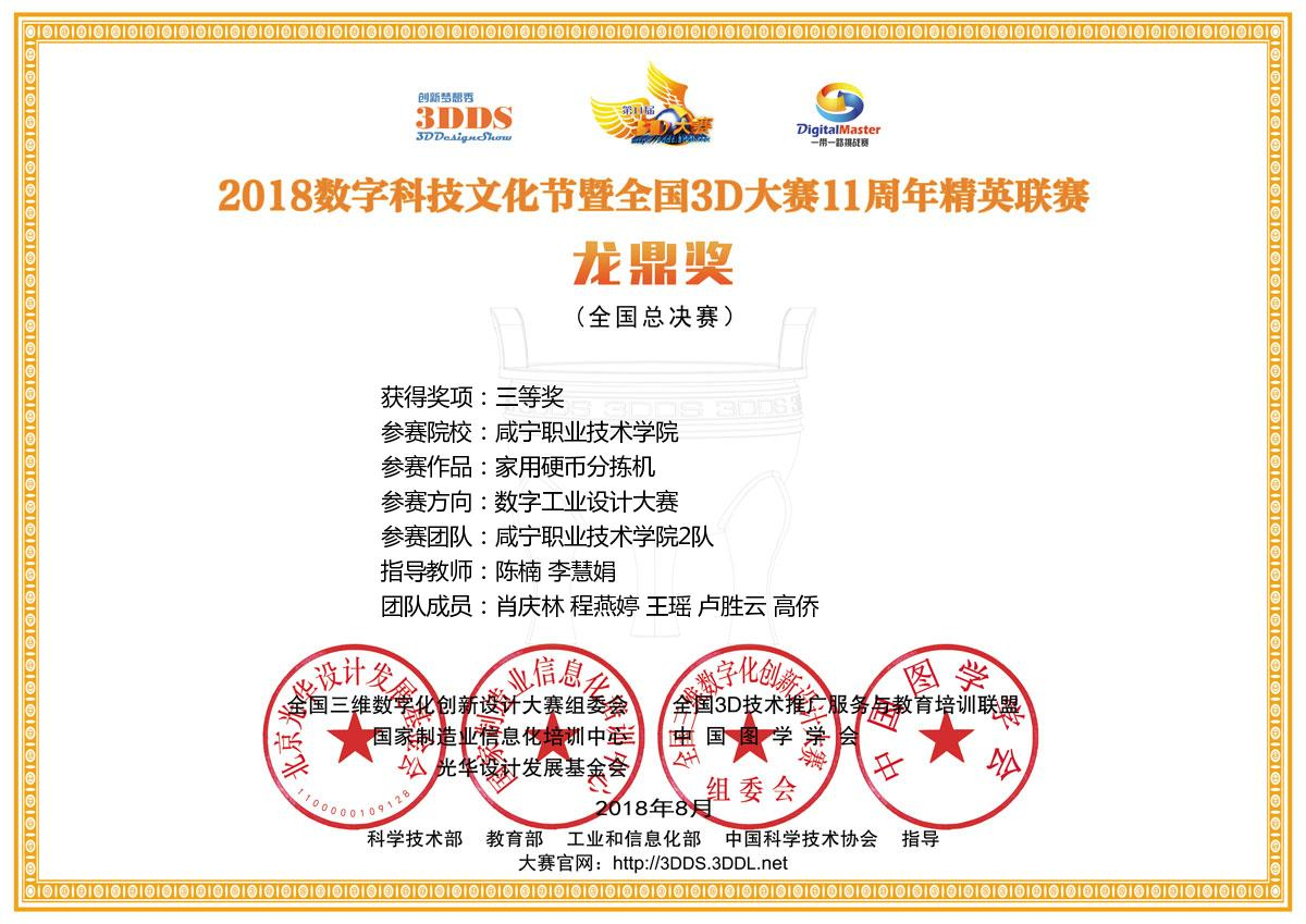 ladbrokes立博高度重视此次比赛,以三维数字化创新设计大赛为抓手,以3D创新协会为平台,全面提高员工创新设计能力。自3月份启动初赛,各专业积极动员、精心组织。为进一步提高员工作品水平,暑假期间师生不惧高温,克服困难,对复赛作品进行集中完善。7月份参加湖北赛区大赛,陈楠、李慧娟老师指导,肖庆林、程燕婷、王瑶等同学设计的作品“家用硬币分拣机”获湖北省特等奖1项,并入围全国总决赛,最终取得了全国三等奖的优秀成绩,为参加下一届大赛奠定了基础。