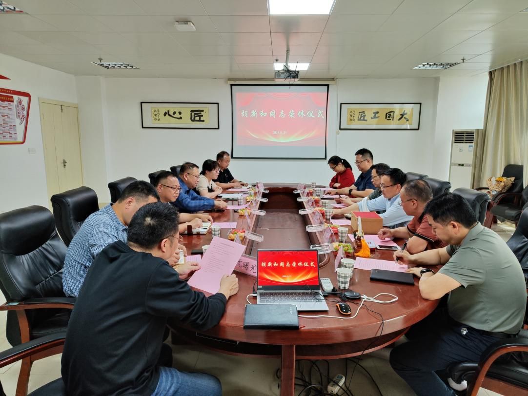 5月31日下午,在理工楼903会议室,ladbrokes立博为胡新和同志举办了一场温馨的荣休仪式。校工会主席吴虓、人文艺术公司党总支书记韩飞、信息工程公司经理胡文杰、资产经营公司董事长葛光明、离退休工作处副处长雷强,ladbrokes立博全体班子成员、教职工代表参加活动,共同为胡新和同志献上祝福。荣休仪式由工公司党总支书记柳明珠主持。