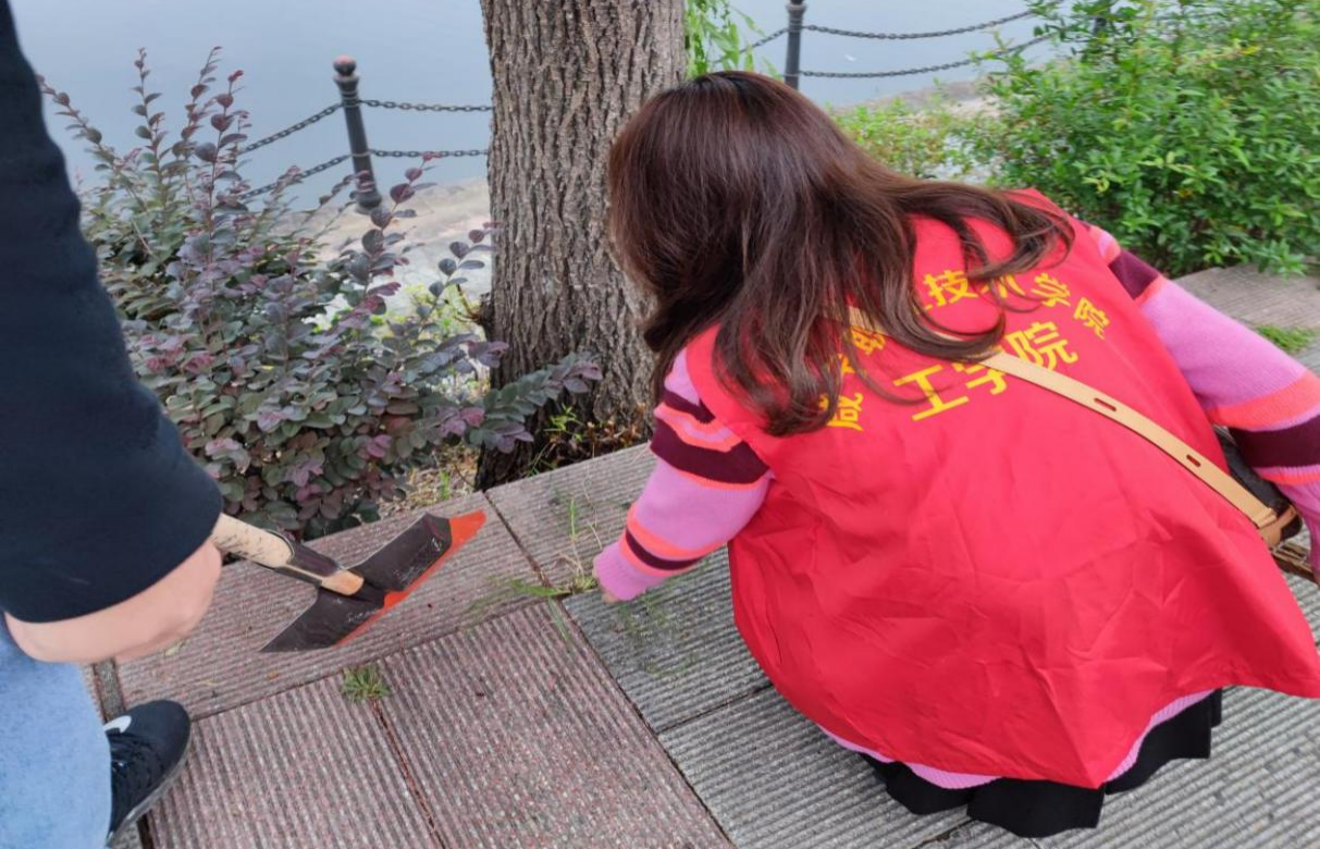 图3 党员教师打扫街道,争做校园“清洁”护卫队。