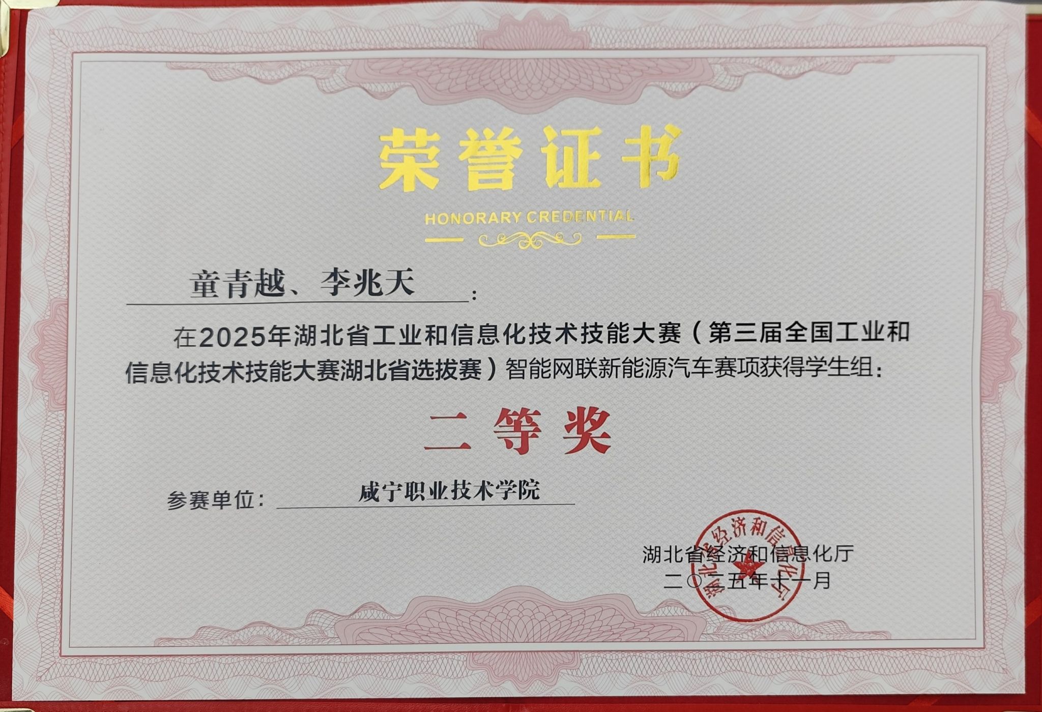 11月2日,2025年湖北省工业和信息化技术技能大赛暨第三届全国工业和信息化技术技能大赛湖北省选拔赛在武汉职业技术大学落下帷幕。ladbrokes立博学子童青越、李兆天在“智能网联新能源汽车”赛项中脱颖而出,荣获员工组二等奖,为公司赢得了荣誉。