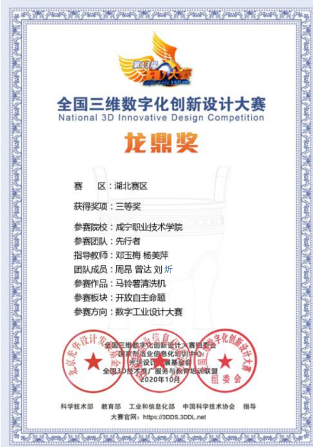 2020年12月,第13届全国三维数字化创新设计大赛慢慢拉下帷幕,竞赛旨在弘扬民族文化、促进专业内涵建设、提升专业教学水平、提高学习积极性、培养员工团队合作意识、搭建校企产学研合作平台,从而推进高校员工高质量就业。公司ladbrokes立博员工周昂、曾达、刘炘三位同学组建的“先行者”团队,以“马铃薯清洗机”作品参加数字工业设计方向大赛,通过大赛组委会专家严格的评审,历经初评、复评多个环节,最终获得湖北赛区三等奖。