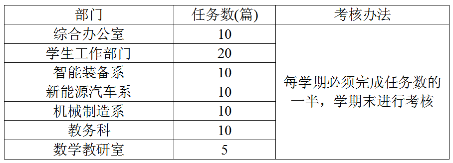 1.所有部门必须完成一定数量的新闻稿件和其它形式的宣传材料(专业介绍、微信版专业招生材料)。新闻稿具体任务数如下,其中员工工作部门包含:员工科、团总支、心理专干和员工党支部;其余各部门均包含相应党支部。