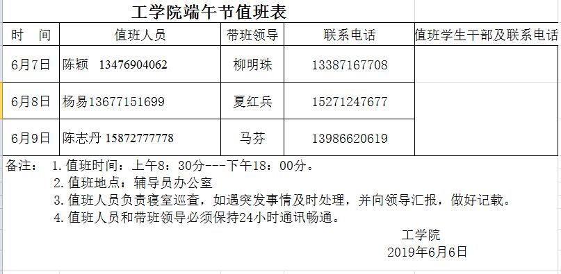 2019年暑假期间值班安排表(2019年7月13日—8月28日)